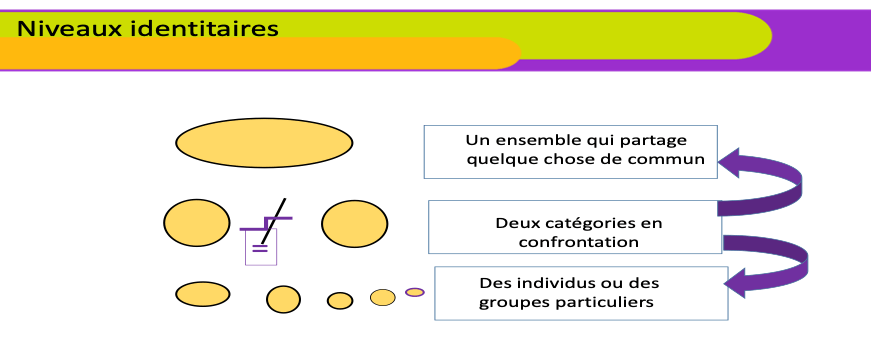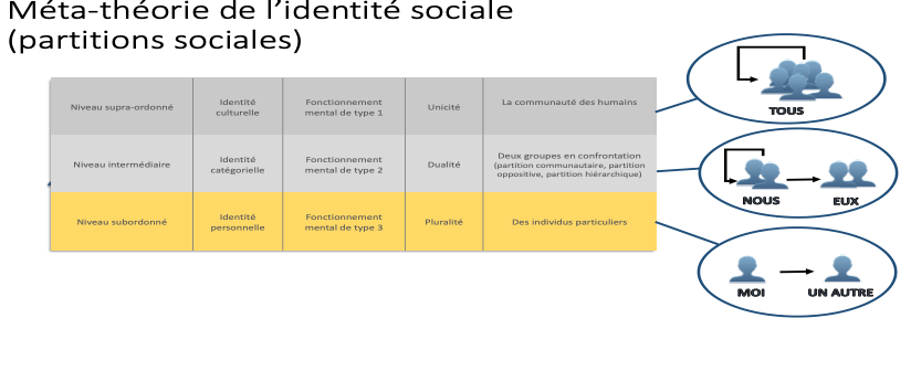 La Théorie de l’auto-catégorisation pose également l’existence de trois niveaux identitaires : – le niveau supra-ordonné (ou spécifique ou culturel) qui se caractérise par la similarité de tous ceux qui en font partie (l’espèce humaine ou les Français ou l’entreprise par exemple), – le niveau intermédiaire (ou social ou catégoriel) qui se caractérise par la confrontation de deux catégories (les femmes et les hommes ou les Parisiens et les provinciaux ou les psychologues du travail et les salariés par exemple), – le niveau subordonné (ou personnel ou individuel (idiotique, particulaire)) où se situent les identités personnelles caractérisées par la pluralité due aux particularités de chacun (des individus, ou plutôt des particuliers ou des gens).