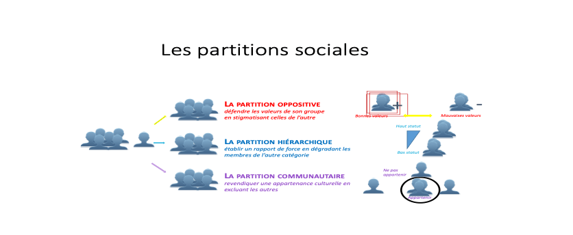 En résumé, dans ce premier état de la théorie, la conception des partitions postule l’existence de trois cadres pouvant structurer une situation mettant en relation deux groupes, le sujet mettant en œuvre, pour améliorer son identité sociale [atteindre un état de bien-être identitaire], le processus de discrimination correspondant (par exemple, s’il se trouve dans une situation de type hiérarchique, il va renforcer son estime de soi (c’est-à-dire acquérir ou maintenir une identité sociale favorable) en creusant l’écart statutaire entre sa catégorie et l’autre catégorie à l’avantage de la sienne).