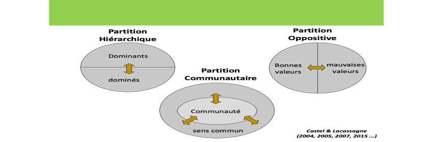 Pour illustrer comment il est possible de lire une même situation comme sous-tendue par des partitions différentes, on peut prendre l’exemple de l’entretien d’évaluation annuel entre un agent de service et son responsable administratif à l’université. La structuration très hiérarchique de ces entretiens (mettant en présence un cadre et un exécutant) ne convient sans doute pas à l’agent de service qui y occupe la « mauvaise » place ; elle peut peut-être également ne pas convenir non plus au responsable administratif, le fait d’avoir des avantages donnés par sa simple position hiérarchique n’étant pas toujours très prestigieux. Pour « s’en sortir » si on peut dire, l’agent aura tendance à voir à travers ces catégories l’opposition entre les valeurs de solidarité de la classe ouvrière d’une part et les valeurs du patronat qui l’exploite d’autre part, autrement dit, une confrontation idéologique c’est-à-dire une partition oppositive. Le responsable administratif pour sa part va considérer le rapport entre ces mêmes catégories comme le contrôle par une minorité experte ayant les compétences et les connaissances pour le faire d’une majorité d’agents n’ayant que des capacités limitées, c’est-à-dire une partition communautaire du type « minorité élitiste » face à une « majorité laborieuse ».